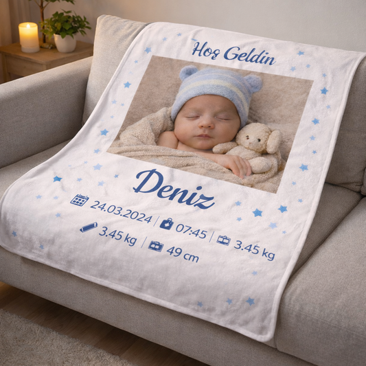 Kişiye Özel Yeni Doğan Bebek Anı Battaniyesi – Fotoğraflı Hoş Geldin Tasarımı
